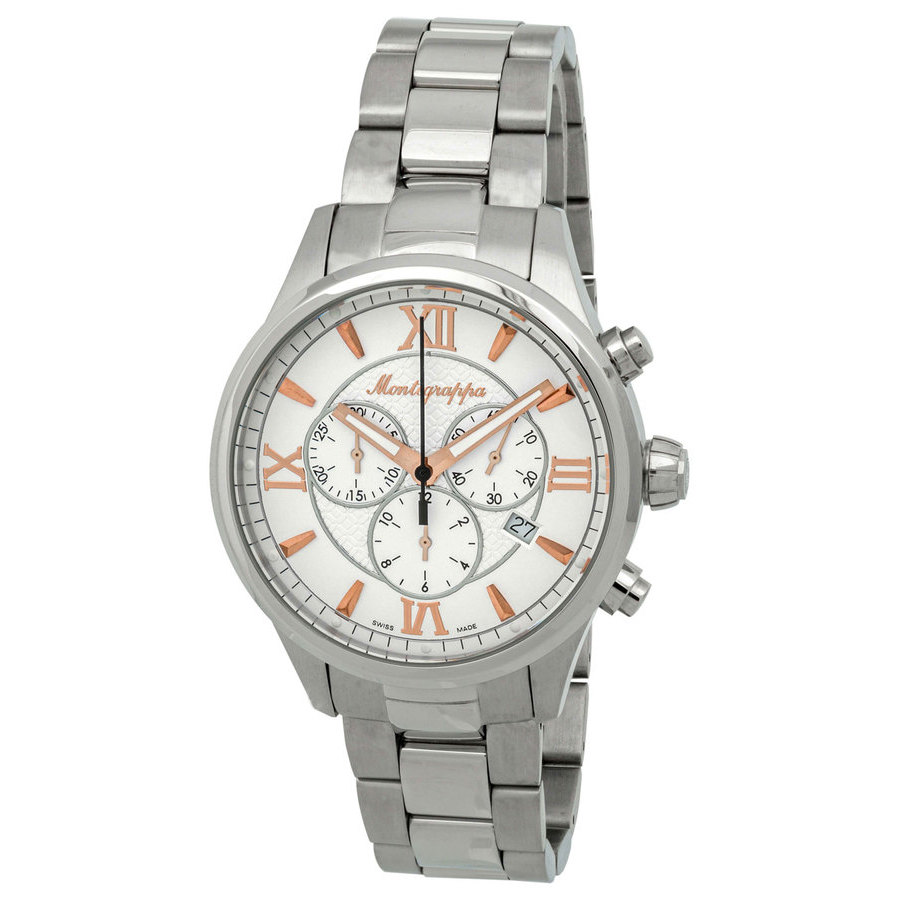 Silver-tone stainless steel case and bracelet. Fixed silver-tone stainless steel bezel. Silver-tone dial with rose gold-tone hands and Roman numeral & index hour markers. Minute markers around the outer rim. Dial Type: Analog. Luminescent hands. Date display at the 4 o'clock position. Chronograph - three sub-dials displaying: 60 second, 30 minute and 12 hour. Ronda 5030 D quartz movement. Scratch resistant sapphire crystal. Screw down crown. Solid case back. Round case shape, case size: 42 mm, case thickness: 12.5 mm. Band width: 20 mm, band length: 8.5 inches. Deployment with push button release clasp. Water resistant at 50 meters / 165 feet. Functions: chronograph, date, hour, minute, second. Fortuna Series. Casual watch style. Watch label: Swiss Made. Montegrappa Fortuna Chronograph Quartz Silver Dial Mens Watch IDFOWCIR.