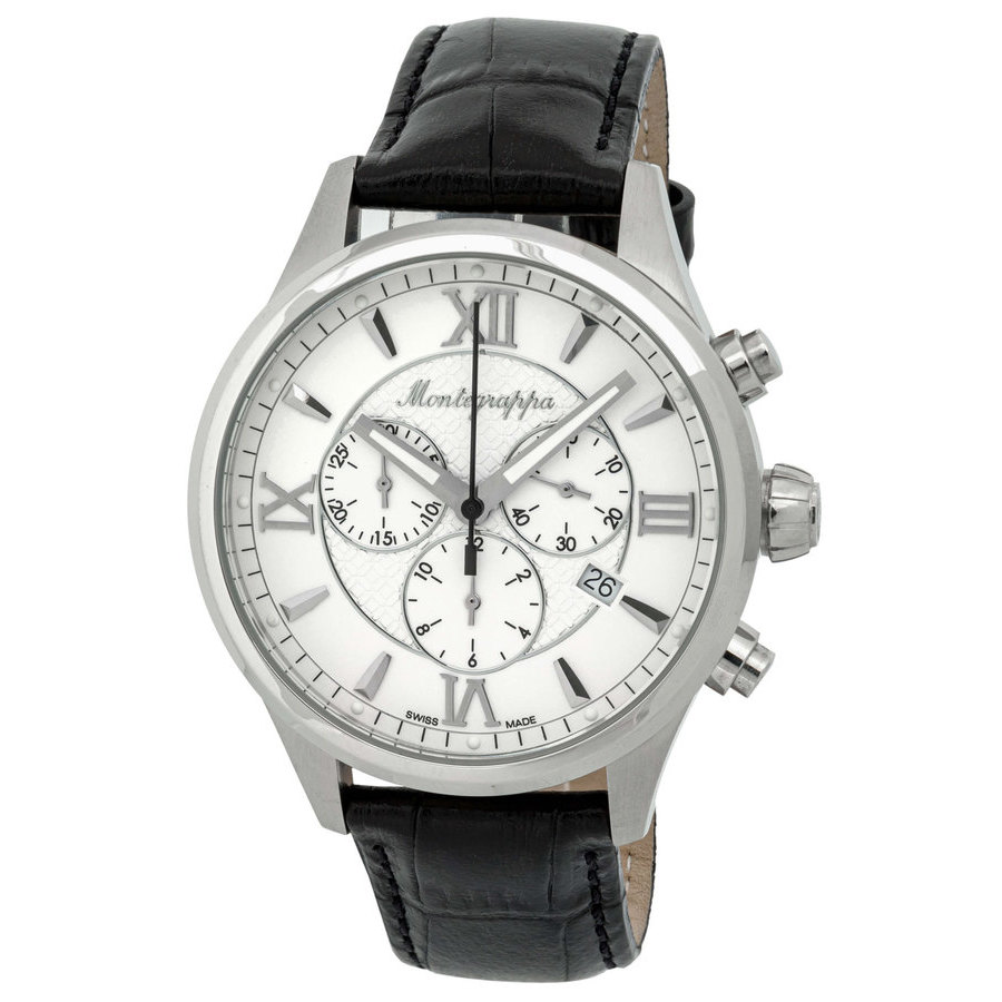 Silver-tone stainless steel case with a black leather strap. Fixed silver-tone stainless steel bezel. Silver-tone dial with silver-tone hands and Roman numeral & index hour markers. Minute markers around the outer rim. Dial Type: Analog. Luminescent hands. Date display at the 4 o'clock position. Chronograph - three sub-dials displaying: 60 second, 30 minute and 12 hour. Ronda 5030 D quartz movement. Scratch resistant sapphire crystal. Screw down crown. Solid case back. Round case shape, case size: 42 mm, case thickness: 12.5 mm. Band width: 20 mm, band length: 7.75 inches. Buckle clasp. Water resistant at 50 meters / 165 feet. Functions: chronograph, date, hour, minute, second. Fortuna Series. Casual watch style. Watch label: Swiss Made. Montegrappa Fortuna Chronograph Quartz Silver Dial Mens Watch IDFOWCLJ.