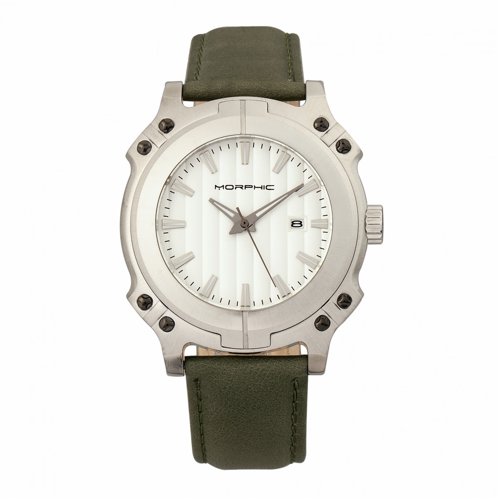Silver-tone stainless steel case with a olive genuine leather strap. Fixed silver-tone stainless steel bezel. Silver-tone dial with silver-tone hands and index hour markers. Minute markers around the outer rim. Dial Type: Analog. Luminescent hands and markers. Date display at the 3 o'clock position. Quartz movement. Scratch resistant mineral crystal. Pull / push crown. Solid case back. Round case shape, case size: 44 mm, case thickness: 13 mm. Band width: 22 mm. Buckle clasp. Water resistant at 50 meters / 165 feet. Functions: date, hour, minute, second. Casual watch style. Watch label: Japan Movt. Item Variations: MPH6801. Morphic M68 Series Silver Dial Mens Watch 6801.