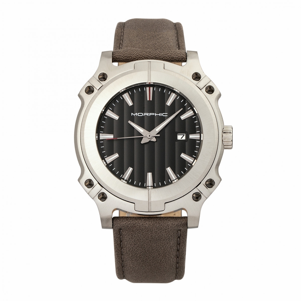 Silver-tone stainless steel case with a grey genuine leather strap. Fixed silver-tone stainless steel bezel. Black dial with silver-tone hands and index hour markers. Minute markers around the outer rim. Dial Type: Analog. Luminescent hands and markers. Date display at the 3 o'clock position. Quartz movement. Scratch resistant mineral crystal. Pull / push crown. Solid case back. Round case shape, case size: 44 mm, case thickness: 13 mm. Band width: 22 mm. Buckle clasp. Water resistant at 50 meters / 165 feet. Functions: date, hour, minute, second. Casual watch style. Watch label: Japan Movt. Item Variations: MPH6802. Morphic M68 Series Black Dial Mens Watch 6802.