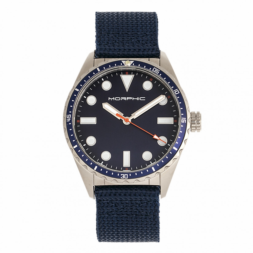 Silver-tone 316L surgical-quality stainless steel case with a blue canvas strap. Fixed blue stainless steel bezel. Blue dial with silver-tone hands and index hour markers. Minute markers around the outer rim. Dial Type: Analog. Luminescent hands and markers. Quartz movement. Scratch resistant mineral crystal. Pull / push crown. Solid case back. Round case shape, case size: 42 mm, case thickness: 12 mm. Band width: 22 mm. Buckle clasp. Water resistant at 50 meters / 165 feet. Functions: hour, minute, second. Casual watch style. Watch label: Japan Movt. Item Variations: MPH6904. Morphic M69 Series Quartz Blue Dial Mens Watch 6904.