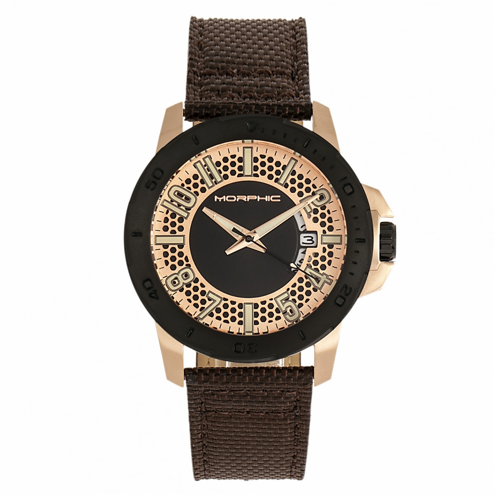 Rose gold-tone 316L surgical-quality stainless steel case with a brown genuine leather strap. Uni-directional rotating black stainless steel bezel. Multicolor dial with Arabic numeral and index hour markers. Minute markers around the outer rim. Dial Type: Analog. Luminescent hands and markers. Date display at the 3 o'clock position. Quartz movement. Scratch resistant mineral crystal. Pull / push crown. Solid case back. Round case shape, case size: 42 mm, case thickness: 13 mm. Band width: 22 mm. Buckle clasp. Water resistant at 50 meters / 165 feet. Functions: date, hour, minute, second. Casual watch style. Watch label: Japan Movt. Item Variations: MPH7004. Morphic M70 Series Quartz Mens Watch 7004.