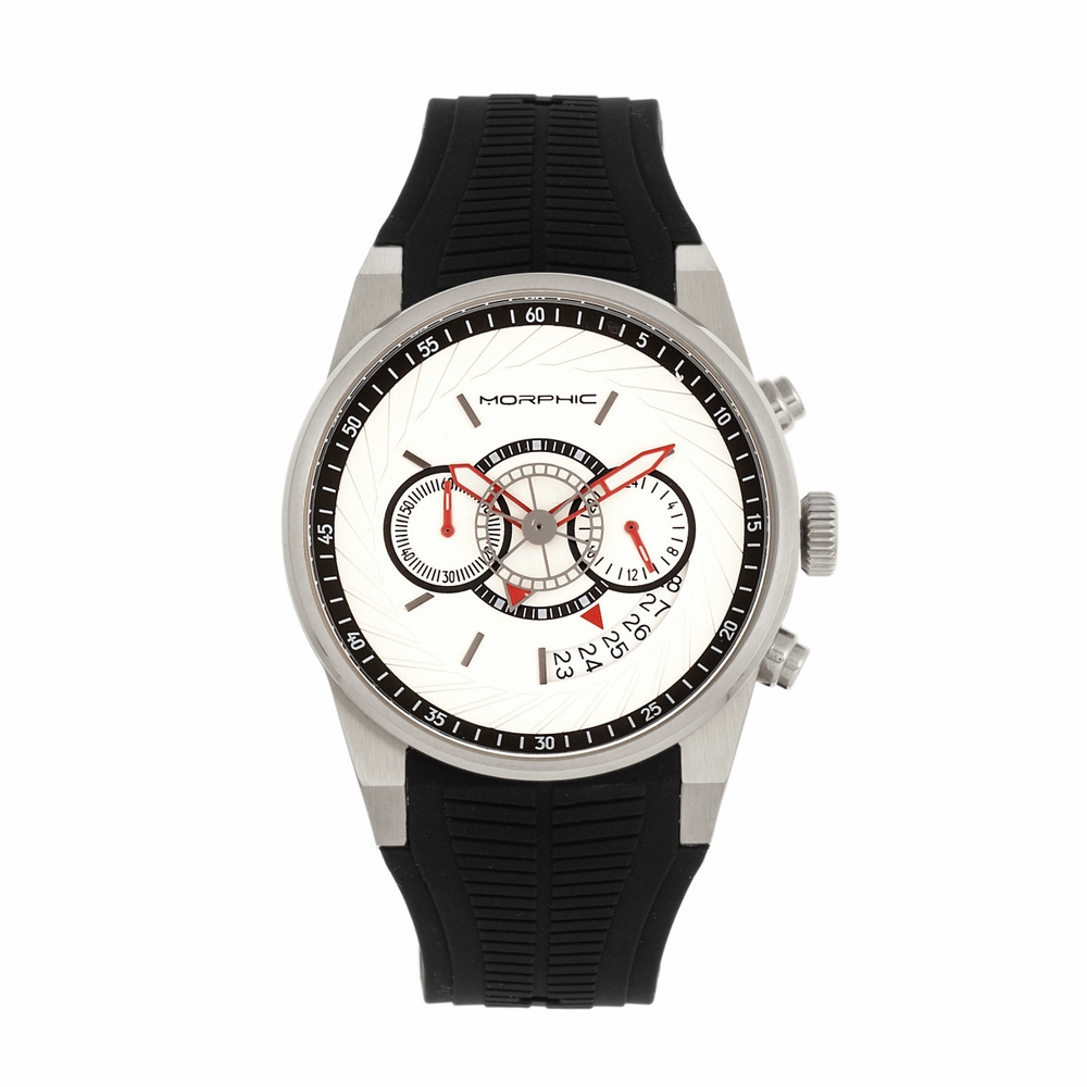 Silver-tone 316L surgical-quality stainless steel case with a black silicone strap. Fixed silver-tone stainless steel bezel. Silver-tone dial with red hands and index hour markers. Minute markers around the outer rim. Dial Type: Analog. Luminescent hands. Date display between 4 and 5 o'clock position. Chronograph - sub-dials displaying: two - 24 hour, 60 minute. Quartz movement. Scratch resistant mineral crystal. Pull / push crown. Solid case back. Round case shape, case size: 43 mm, case thickness: 11 mm. Band width: 21 mm. Buckle clasp. Water resistant at 50 meters / 165 feet. Functions: chronograph, date, hour, minute, second. Dress watch style. Watch label: Japan Movt. Item Variations: MPH7201. Morphic M72 Series Chronograph Quartz Silver Dial Mens Watch 7201.