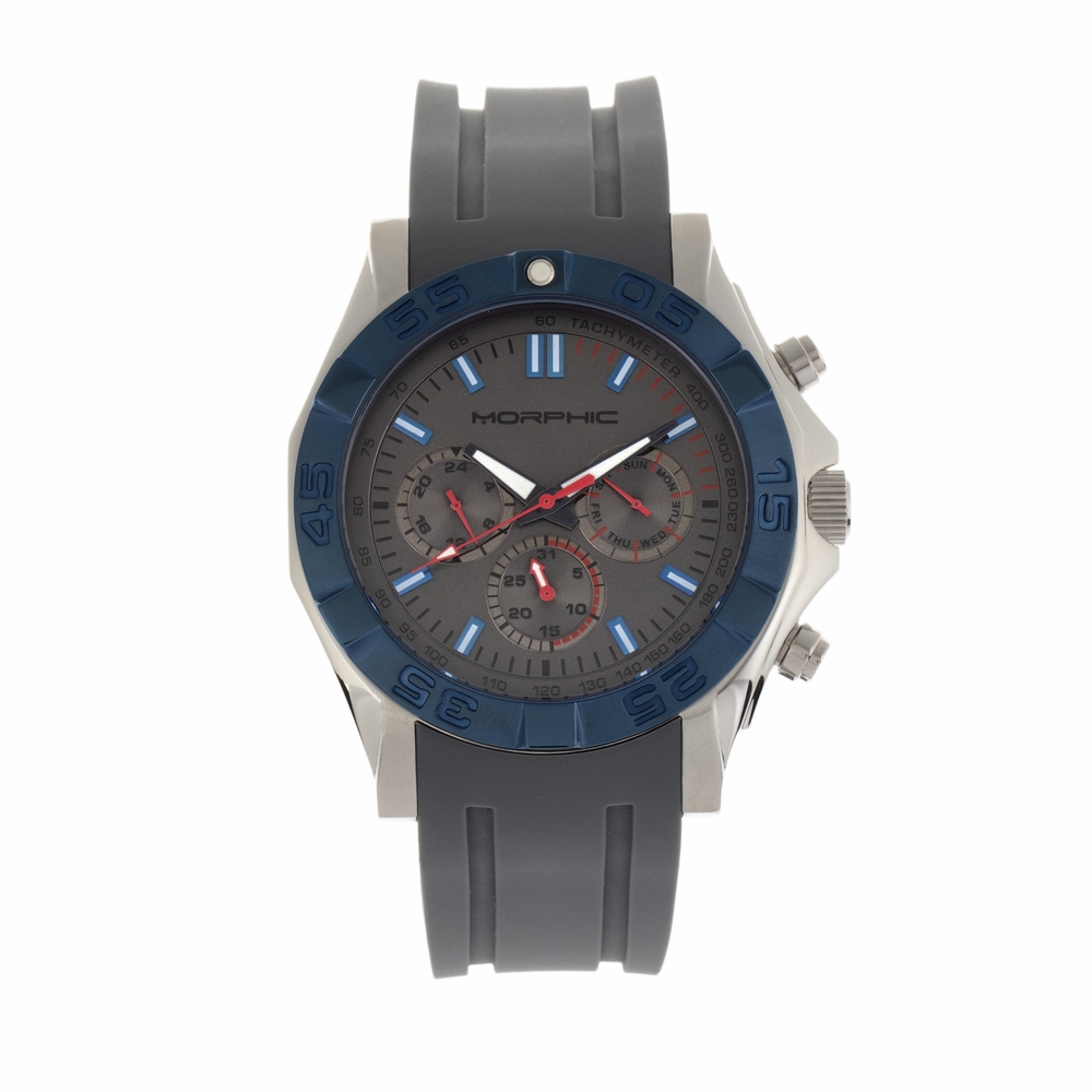 Silver-tone 316L stainless steel case with a grey silicone strap. Fixed blue stainless steel bezel. Grey dial with black hands and index hour markers. Tachymeter scale around the outer rim. Dial Type: Analog. Luminescent hands and markers. Date display at the 6 o'clock position. Quartz movement. Scratch resistant mineral crystal. Pull / push crown. Solid case back. Tonneau case shape, case size: 52 mm, case thickness: 12 mm. Band width: 24 mm. Buckle clasp. Water resistant at 50 meters / 165 feet. Functions: date, day, GMT, second time zone, hour, minute, second. Sport watch style. Watch label: Japan Movt. Item Variations: MPH7503. Morphic M75 Series Quartz Grey Dial Mens Watch 7503.