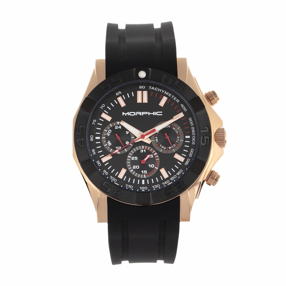 Rose gold-tone 316L stainless steel case with a black silicone strap. Fixed black stainless steel bezel. Black dial with gold-tone hands and index hour markers. Tachymeter scale around the outer rim. Dial Type: Analog. Luminescent hands and markers. Date display at the 6 o'clock position. Quartz movement. Scratch resistant mineral crystal. Pull / push crown. Solid case back. Tonneau case shape, case size: 52 mm, case thickness: 12 mm. Band width: 24 mm. Buckle clasp. Water resistant at 50 meters / 165 feet. Functions: date, day, GMT, second time zone, hour, minute, second. Sport watch style. Watch label: Japan Movt. Item Variations: MPH7505. Morphic M75 Series Quartz Black Dial Mens Watch 7505.