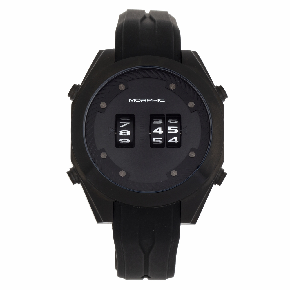 Black 316L stainless steel case with a black silicone strap. Fixed black stainless steel bezel. Black dial. Dial Type: Analog. Drum-Roll quartz movement. Scratch resistant mineral crystal. Pull / push crown. Solid case back. Tonneau case shape, case size: 46 mm, case thickness: 16 mm. Band width: 20 mm. Buckle clasp. Water resistant at 50 meters / 165 feet. Functions: hour, minute. Sport watch style. Watch label: Japan Movt. Item Variations: MPH7606. Morphic M76 Series Quartz Black Dial Mens Watch 7606.
