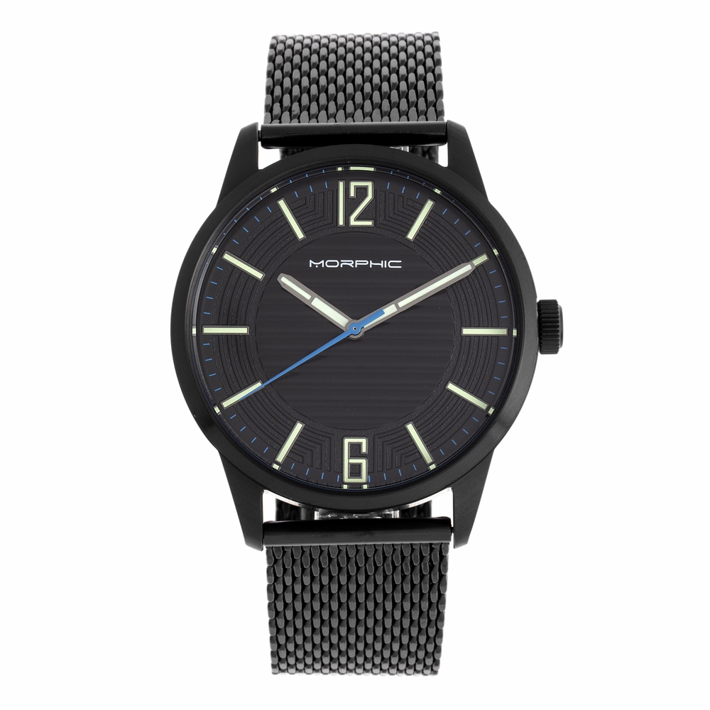Black 316L stainless steel case with a black 316L stainless steel bracelet. Fixed black 316L stainless steel bezel. Black dial with silver-tone hands and Arabic numeral and index hour markers. Minute markers around the outer rim. Dial Type: Analog. Luminescent hands and markers. Quartz movement. Scratch resistant mineral crystal. Pull / push crown. Solid case back. Round case shape, case size: 42 mm, case thickness: 11 mm. Band width: 20 mm. Jewelry with safety clasp. Water resistant at 50 meters / 165 feet. Functions: hour, minute, second. Casual watch style. Watch label: Japan Movt. Item Variations: MPH7702. Morphic M77 Series Quartz Black Dial Mens Watch 7702.