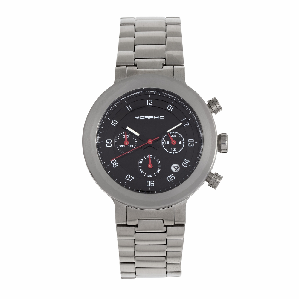 Silver-tone 316L stainless steel case with a silver-tone stainless steel bracelet. Fixed black stainless steel bezel. Black dial with black hands and Arabic numeral hour markers. Minute markers around the outer rim. Dial Type: Analog. Luminescent hands. Date display between 4 and 5 o'clock position. Chronograph - sub-dials displaying: three - 60 second, 30 minute and 24 hour. Quartz movement. Scratch resistant mineral crystal. Pull / push crown. Solid case back. Round case shape, case size: 43 mm, case thickness: 13 mm. Band width: 22 mm. Fold over push button deployment clasp. Water resistant at 100 meters / 330 feet. Functions: chronograph, GMT, date, hour, minute, second. Sport watch style. Watch label: Japan Movt. Item Variations: MPH7802. Morphic M78 Series Chronograph Quartz Black Dial Mens Watch 7802.