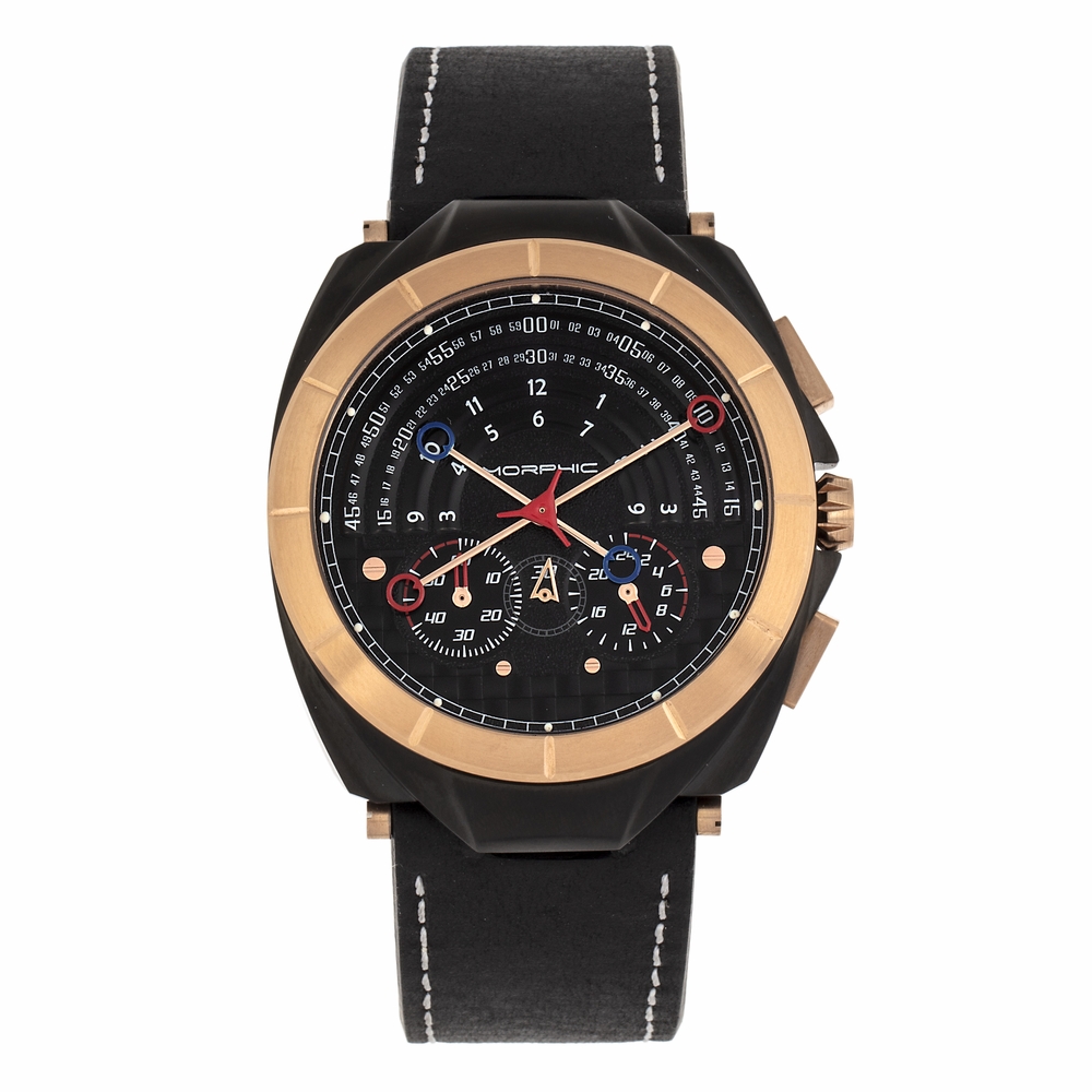 Black 316L surgical-quality stainless steel case with a black genuine leather strap. Fixed rose gold-tone stainless steel bezel. Black dial with Arabic numeral hour markers. Dial Type: Analog. Chronograph - sub-dials displaying: three - 60 second, 60 minute and 24 hour. Quartz movement. Scratch resistant mineral crystal. Pull / push crown. Solid case back. Tonneau case shape, case size: 46 mm, case thickness: 13 mm. Band width: 24 mm. Buckle clasp. Water resistant at 50 meters / 165 feet. Functions: chronograph, hour, minute, second. Sport watch style. Watch label: Japan Movt. Item Variations: MPH7906. Morphic M79 Series Chronograph Quartz Black Dial Mens Watch 7906.