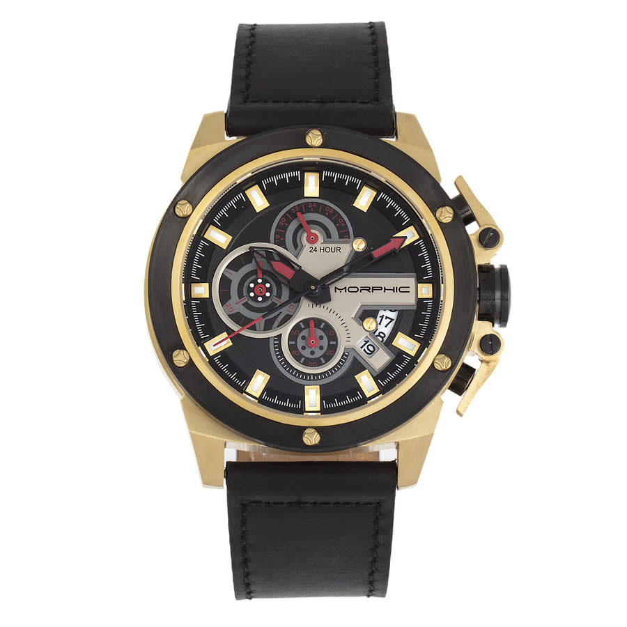Gold-tone stainless steel case with a black genuine leather strap. Fixed black stainless steel bezel. Black dial with black & red hands and index hour markers. Minute scale around the inner rim. Dial Type: Analog. Luminescent hands and markers. Date display between 4 and 5 o'clock position. Chronograph - three sub-dials displaying: 60 small second, 30 minute, 24 hour. Quartz movement. Scratch resistant mineral crystal. Pull / push crown. Solid case back. Round case shape, case size: 47 mm, case thickness: 13 mm. Band width: 24 mm, band length: 9 inches. Buckle clasp. Water resistant at 100 meters / 330 feet. Functions: chronograph, date, hour, minute, second. M81 Series Series. Casual watch style. Watch label: Japan Movt. Morphic M81 Series Black Dial Mens Watch MPH8103.