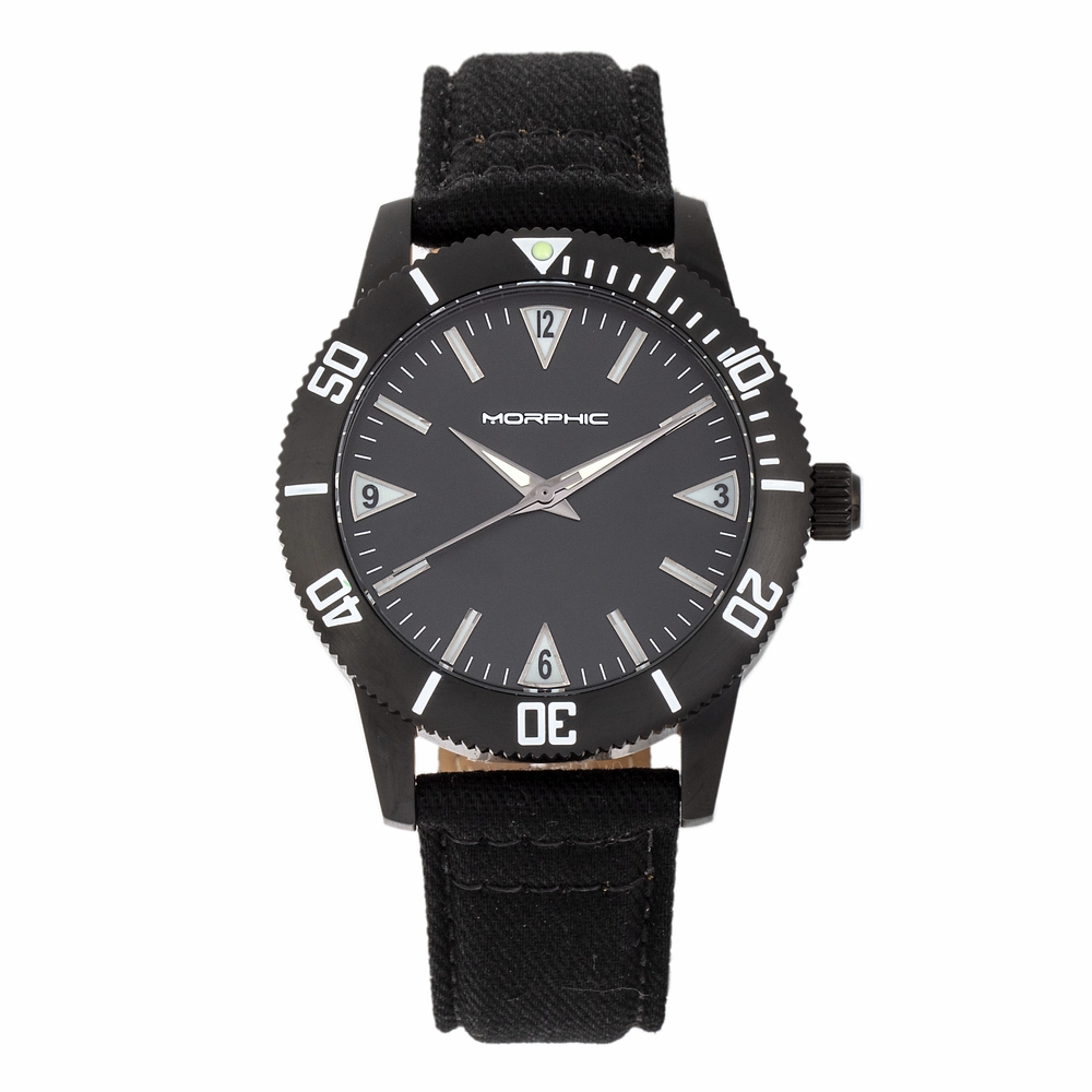 Black 316L surgical-quality stainless steel case with a black genuine leather strap. Black stainless steel bezel. Black dial with silver-tone hands and index hour markers. Minute markers around the outer rim. Dial Type: Analog. Luminescent hands and markers. Quartz movement. Scratch resistant mineral crystal. Pull / push crown. Solid case back. Round case shape, case size: 41 mm, case thickness: 12 mm. Band width: 19 mm. Buckle clasp. Water resistant at 100 meters / 330 feet. Functions: hour, minute, second. Casual watch style. Watch label: Japan Movt. Item Variations: MPH8502. Morphic M85 Series Quartz Black Dial Mens Watch 8502.