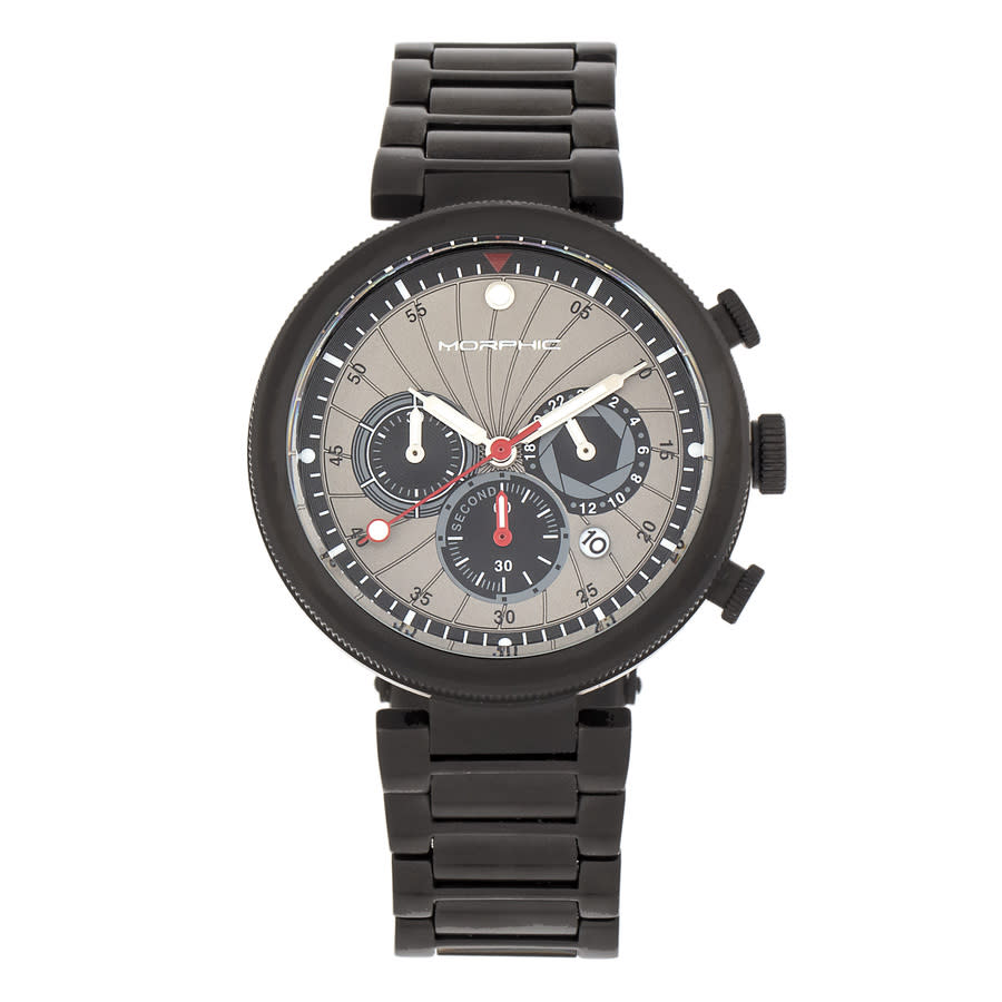 Band Color: Black Stainless Steel; Band Width: 21mm near case; 20mm near clasp/buckle; Bezel Color: Black; Case: Black + Circle-Shaped; Case Finish: Brushed + Stainless Steel; Case Thickness: 15mm; Case Width: 43mm; 47mm with Crown; Clasp / Buckle: Fold Over Push Button Deployment; Dial: Grey + Analog; Hand Color: Silver; Movement: Japanese + Quartz; Time Zones: Single; Water Resistance: 10 ATM.