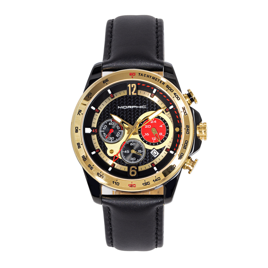 Black stainless steel case with a black genuine leather strap. Fixed gold-tone stainless steel bezel. Black dial with gold-tone dauphine-style shape hands and Arabic numeral & index hour markers. Minute scale around the inner rim. Dial Type: Analog. Luminescent hands and markers. Date display between 4 and 5 o'clock position. Chronograph - three sub-dials displaying: 60 small second, 60 minute, 24 hour. Quartz movement. Scratch resistant mineral crystal. Pull / push crown. Solid case back. Round case shape, case size: 45 mm, case thickness: 12 mm. Band width: 22 mm, band length: 9.01 inches. Buckle clasp. Water resistant at 50 meters / 165 feet. Functions: chronograph, date, hour, minute, second, tachymeter, 24 hour. M88 Series Series. Casual watch style. Watch label: Japan Movt. Morphic M88 Series Chronograph Quartz Black Dial Mens Watch MPH8805.