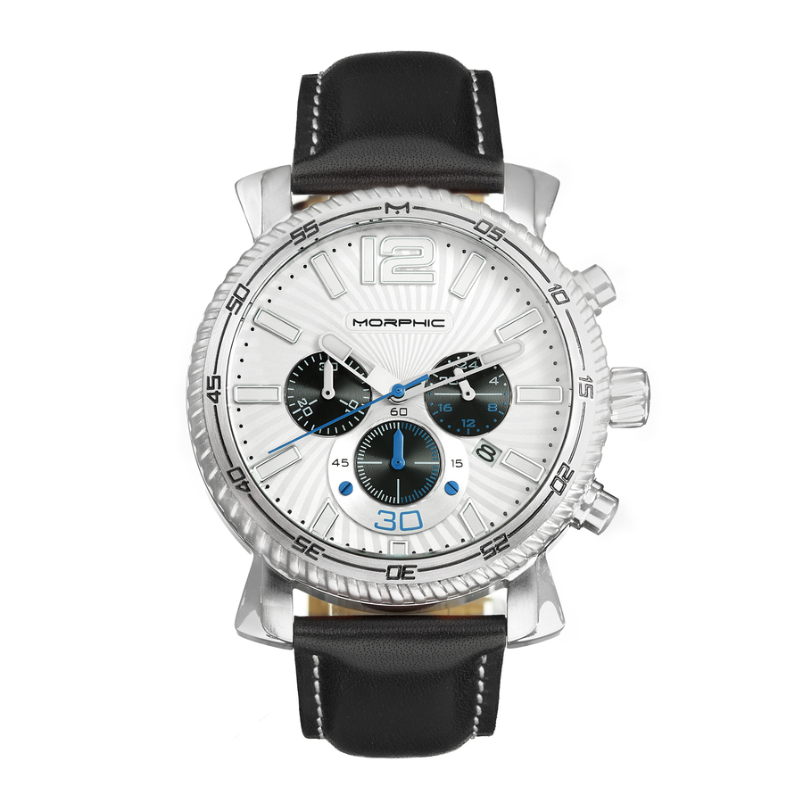 Silver-tone stainless steel case with a black genuine leather strap. Fixed silver-tone stainless steel bezel. White dial with silver-tone hands and Roman numeral & index hour markers. Minute scale around the inner rim. Dial Type: Analog. Luminescent hands and markers. Date display at the 4 o'clock position. Chronograph - sub-dials displaying: three - 60 small second, 24 hour, 30 minutes. Quartz movement. Scratch resistant mineral crystal. Pull / push crown. Solid case back. Round case shape, case size: 44 mm, case thickness: 11 mm. Band width: 22 mm, band length: 9 inches. Buckle clasp. Water resistant at 50 meters / 165 feet. Functions: date, hour, minute, second. Casual watch style. Watch label: Japan Movt. Morphic M89 Series Quartz White Dial Mens Watch MPH8901.