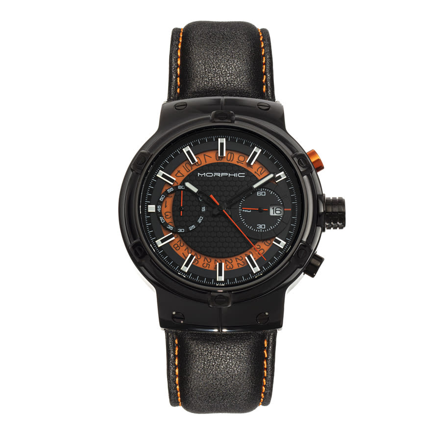 Black stainless steel case with a black genuine leather strap. Black stainless steel bezel. Orange dial with black pencil-style shape hands and index hour markers. Minute scale around the inner rim. Dial Type: Analog. Luminescent hands and markers. Date display at the 3 o'clock position. Chronograph - three sub-dials displaying: 60 small second, 60 minute, Analog dial. Quartz movement. Scratch resistant mineral crystal. Pull / push crown. Solid case back. Round case shape, case size: 45 mm, case thickness: 12 mm. Band width: 24 mm, band length: 8.75 inches. Buckle clasp. Water resistant at 50 meters / 165 feet. Functions: date, hour, minute, second. M91 Series Series. Casual watch style. Watch label: Japan Movt. Morphic M91 Series Quartz Orange Dial Mens Watch MPH9105.