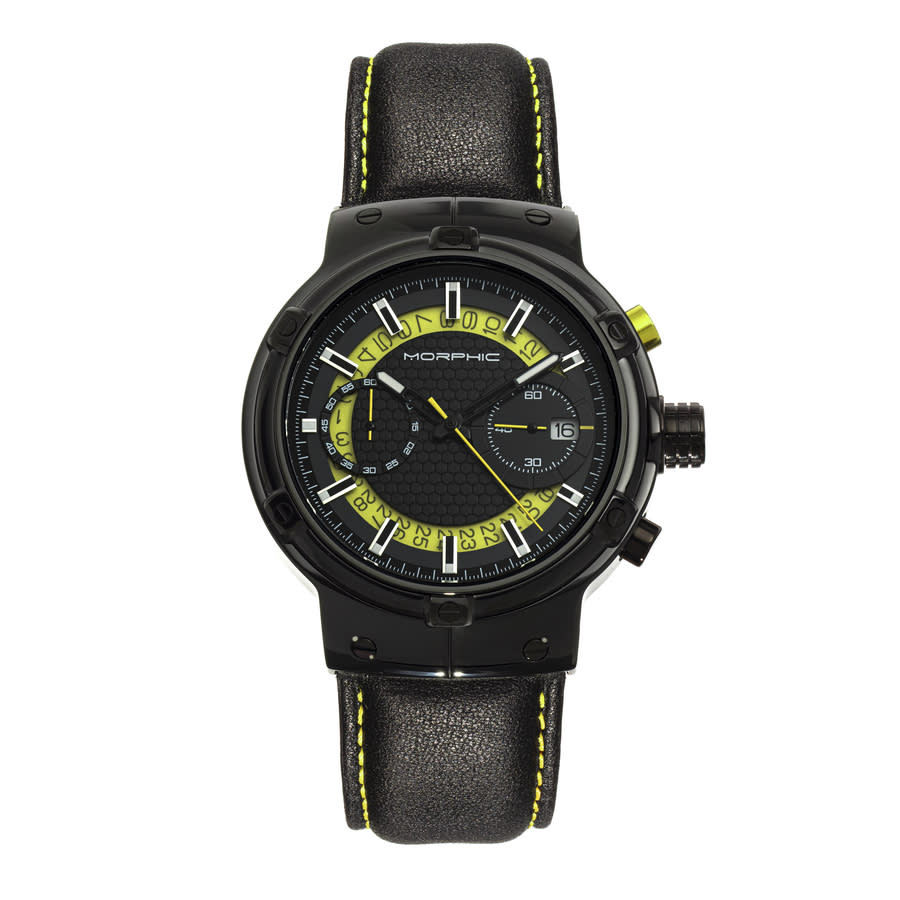 Black stainless steel case with a black genuine leather strap. Black stainless steel bezel. Yellow dial with black pencil-style shape hands and index hour markers. Minute scale around the inner rim. Dial Type: Analog. Luminescent hands and markers. Date display at the 3 o'clock position. Chronograph - three sub-dials displaying: 60 small second, 60 minute, Analog dial. Quartz movement. Scratch resistant mineral crystal. Pull / push crown. Solid case back. Round case shape, case size: 45 mm, case thickness: 12 mm. Band width: 24 mm, band length: 8.75 inches. Buckle clasp. Water resistant at 50 meters / 165 feet. Functions: date, hour, minute, second. M91 Series Series. Casual watch style. Watch label: Japan Movt. Morphic M91 Series Quartz Mens Watch MPH9106.