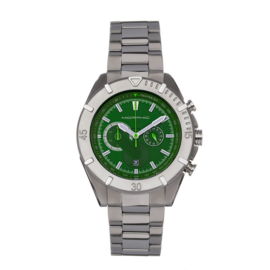 Band Color: Silver Stainless Steel; Band Width: 22mm near case; 20mm near clasp/buckle; Bezel Color: Silver; Case: Silver + Circle-Shaped; Case Finish: Polished + Stainless Steel; Case Thickness: 12mm; Case Width: 47mm; 48mm with Crown; Clasp / Buckle: Fold Over Push Button Deployment; Dial: Green + Analog; Hand Color: Silver; Movement: Japanese + Quartz; Time Zones: Single; Water Resistance: 10 ATM.