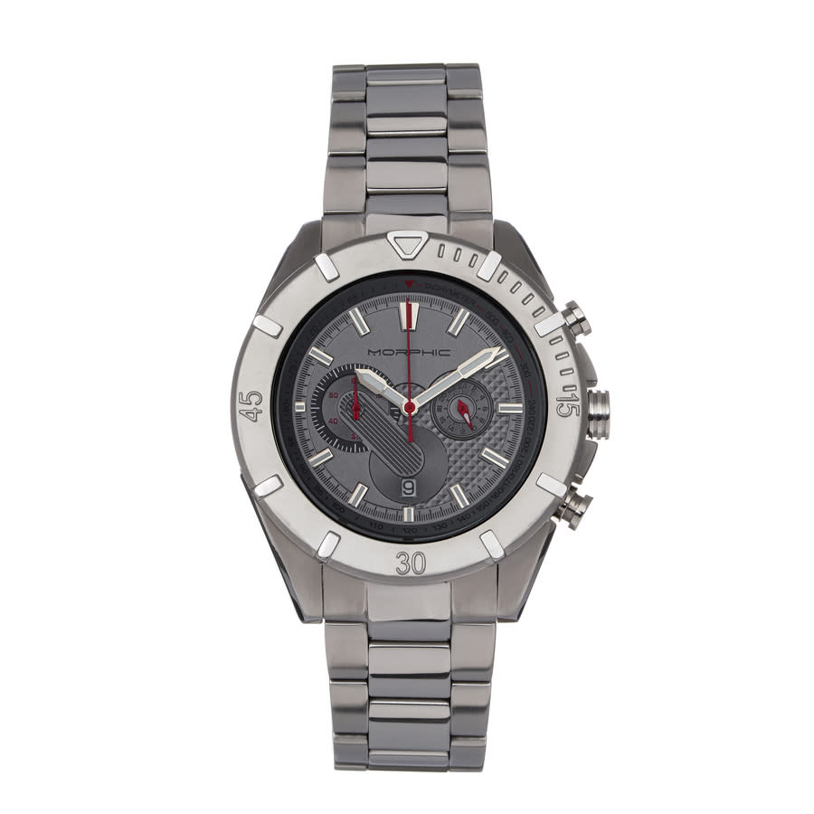 Band Color: Silver Stainless Steel; Band Width: 22mm near case; 20mm near clasp/buckle; Bezel Color: Silver; Case: Silver + Circle-Shaped; Case Finish: Polished + Stainless Steel; Case Thickness: 12mm; Case Width: 47mm; 48mm with Crown; Clasp / Buckle: Fold Over Push Button Deployment; Dial: Grey + Analog; Hand Color: Silver; Movement: Japanese + Quartz; Time Zones: Single; Water Resistance: 10 ATM.