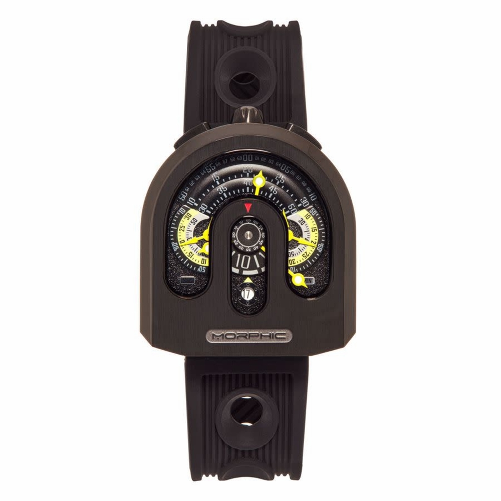 Band Color: Black Stainless Steel; Band Width: 24mm near case; 22mm near clasp/buckle; Bezel Color: Black; Case: Black + Half Stadium-Shaped; Case Finish: Brushed + Stainless Steel; Case Thickness: 14mm; Case Width: 41mm; 44mm with Crown; Clasp / Buckle: Strap Buckle; Dial: Black + Analog; Hand Color: Yellow; Movement: Japanese + Quartz; Time Zones: Single; Water Resistance: 5 ATM.