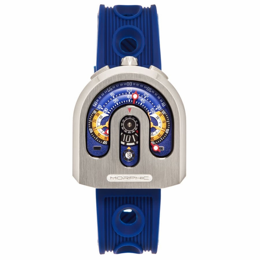 Band Color: Blue Stainless Steel; Band Width: 24mm near case; 22mm near clasp/buckle; Bezel Color: Silver; Case: Silver + Half Stadium-Shaped; Case Finish: Brushed + Stainless Steel; Case Thickness: 14mm; Case Width: 41mm; 44mm with Crown; Clasp / Buckle: Strap Buckle; Dial: Blue + Analog; Hand Color: Red; Movement: Japanese + Quartz; Time Zones: Single; Water Resistance: 5 ATM.