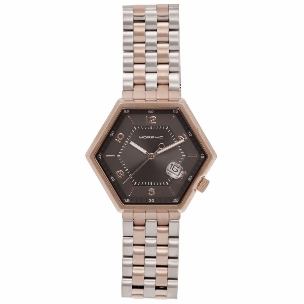 Band Color: Silver & Rose Gold Stainless Steel; Band Width: 20mm near case; 20mm near clasp/buckle; Bezel Color: Rose Gold; Case: Rose Gold + Hexagon-Shaped; Case Finish: Polished + Stainless Steel; Case Thickness: 14mm; Case Width: 45mm; 43mm with Crown; Clasp / Buckle: Butterfly; Dial: Grey + Analog; Hand Color: Rose Gold; Movement: Japanese + Quartz; Time Zones: Single; Water Resistance: 5 ATM.