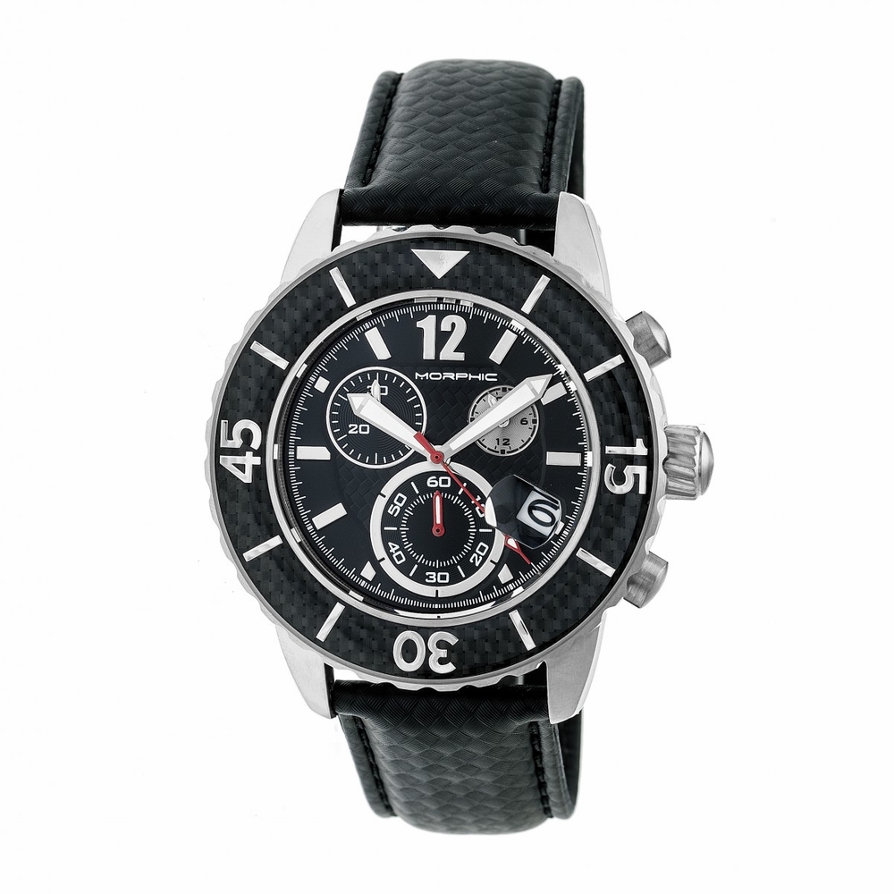 Silver-tone stainless steel case with a black leather strap. Fixed black stainless steel bezel. Black dial with silver-tone hands and Arabic numeral and index hour markers. Minute markers around the outer rim. Dial Type: Analog. Luminescent hands. Date display at the 4 o'clock position. Quartz movement. Scratch resistant mineral crystal. Pull / push crown. Solid case back. Round case shape, case size: 45 mm, case thickness: 14 mm. Band width: 22 mm. Buckle clasp. Water resistant at 100 meters / 330 feet. Functions: chronograph, date, hour, minute, second. Sport watch style. Watch label: Japan Movt. Item Variations: MPH5101. Morphic M51 Series Chronograph Black Dial Mens Watch 5101.