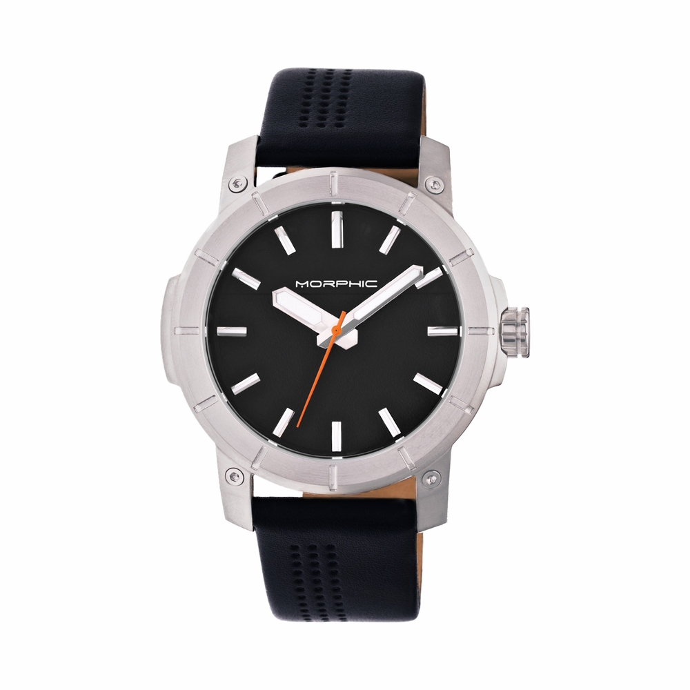 Silver-tone stainless steel case with a black leather strap. Fixed silver-tone bezel. Black dial with silver-tone hands and index hour markers. Dial Type: Analog. Luminescent hands and markers. Quartz movement. Scratch resistant mineral crystal. Round case shape, case size: 46 mm, case thickness: 11 mm. Band width: 22 mm. Buckle clasp. Water resistant at 50 meters / 165 feet. Functions: hour, minute, second. Casual watch style. Watch label: Japan Movt. Item Variations: MPH5401. Morphic M54 Series Black Dial Mens Watch 5401.
