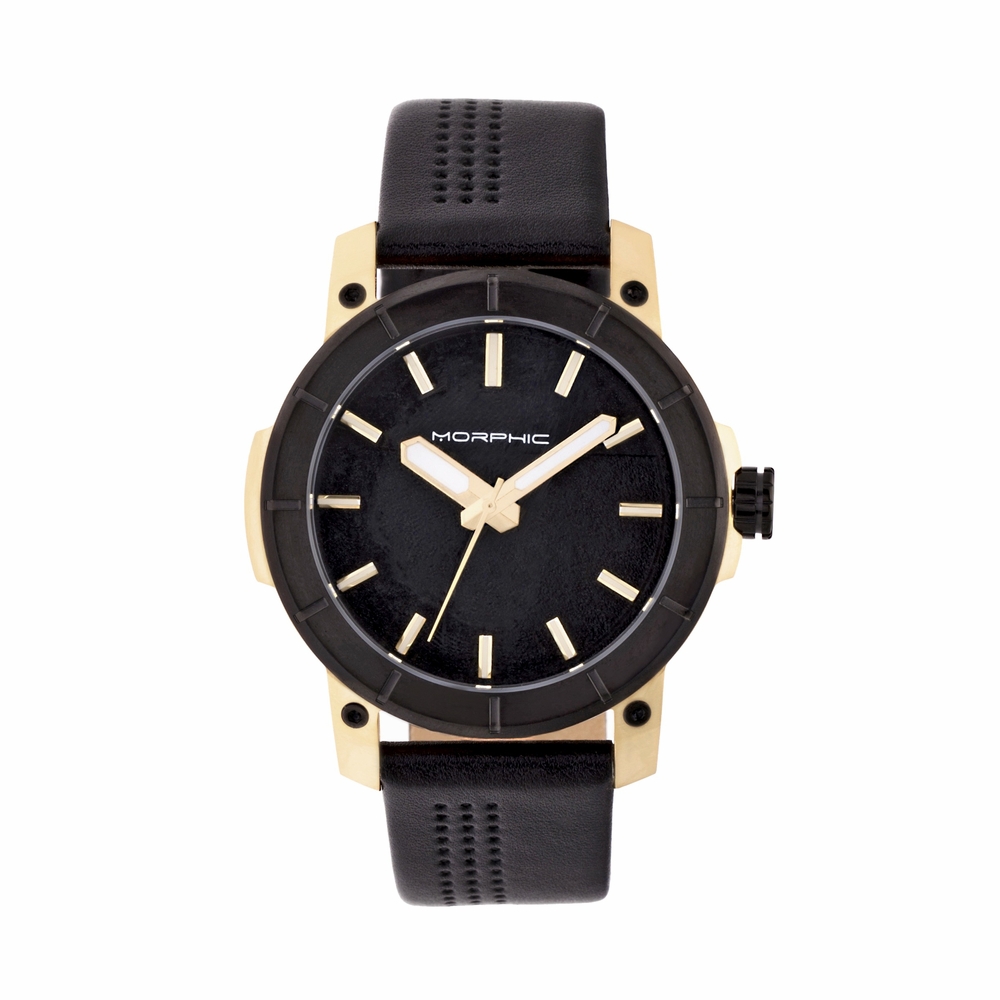 Gold-tone stainless steel case with a black leather strap. Fixed black bezel. Black dial with gold-tone hands and index hour markers. Minute markers around the outer rim. Dial Type: Analog. Luminescent hands and markers. Quartz movement. Scratch resistant mineral crystal. Round case shape, case size: 46 mm, case thickness: 11 mm. Band width: 22 mm. Buckle clasp. Water resistant at 50 meters / 165 feet. Functions: hour, minute, second. Casual watch style. Watch label: Japan Movt. Item Variations: MPH5405. Morphic M54 Series Black Dial Mens Watch 5405.