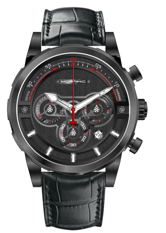Black stainless steel case with a black leather strap. Fixed black bezel. Black dial with silver-tone hands and index hour markers. Dial Type: Analog. Luminescent hands. Date display between 4 and 5 o'clock position. Quartz movement. Scratch resistant mineral crystal. Round case shape, case size: 40 mm, case thickness: 12 mm. Band width: 20 mm. Buckle clasp. Water resistant at 100 meters / 330 feet. Functions: chronograph, date, hour, minute, second. Sport watch style. Watch label: Japan Movt. Item Variations: MPH6005. Morphic M60 Series Chronograph Black Dial Mens Watch 6005.