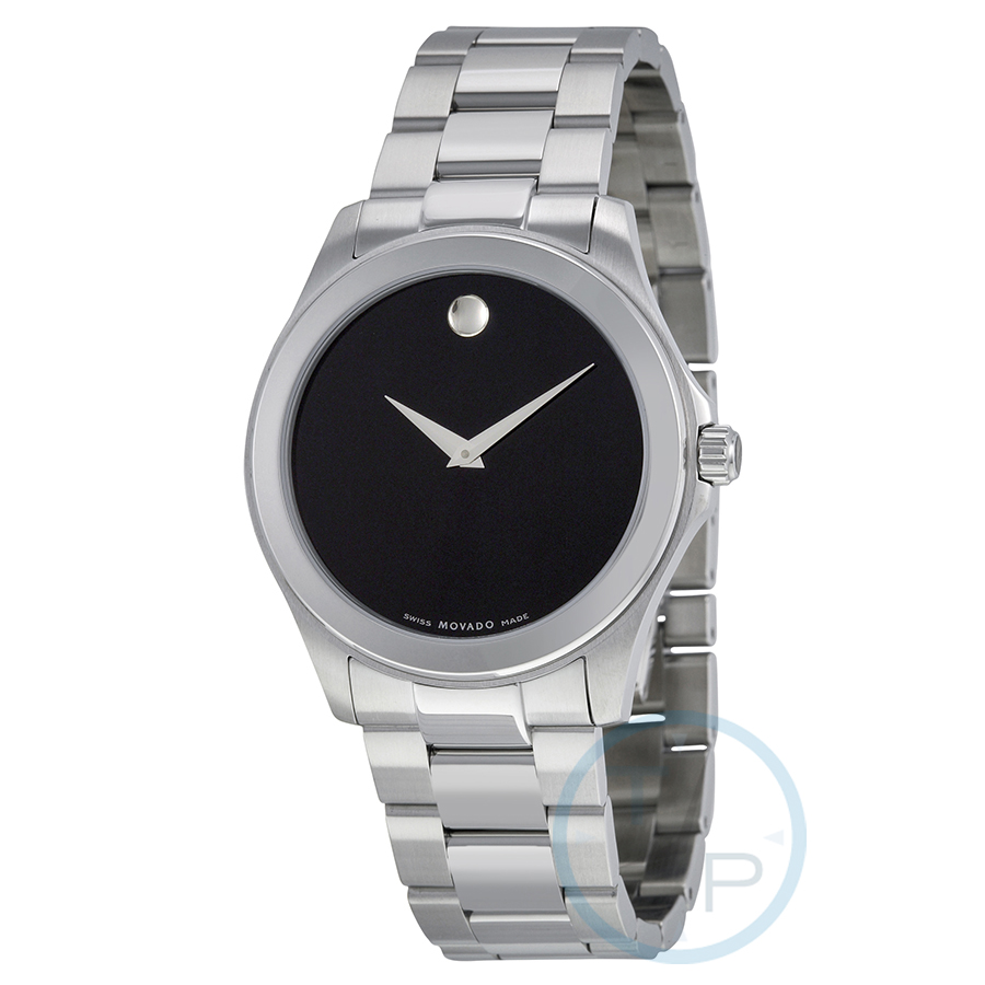 Stainless steel case with a stainless steel bracelet. Fixed stainless steel bezel. Black dial with silver-tone hands. No markers. The signature Movado dot appears at the 12 o'clock position. Dial Type: Analog. Swiss quartz movement. Scratch resistant sapphire crystal. Pull / push crown. Solid case back. Case diameter: 38.5 mm. Case thickness: 6.9 mm. Round case shape. Band width: 20 mm. Band length: 8.5 inches. Hidden deployment clasp. Water resistant at 30 meters / 100 feet. Functions: sport. Fashion watch style. Watch label: Swiss Made. Item Variations: 605746, 0605746, Movado-605746, Movado-0605746. Movado Junior Sport Black Dial Stainless Steel Men's Watch 0605746.