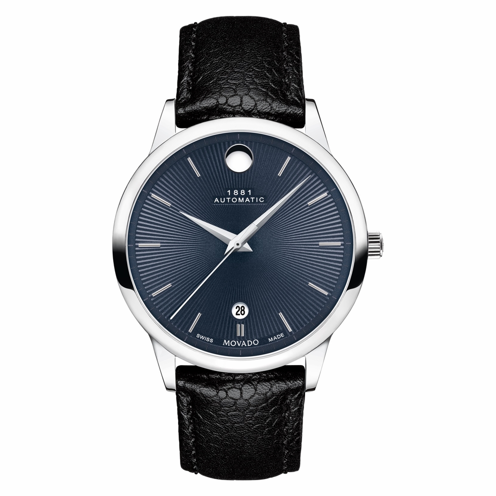 Stainless steel case with a black leather strap. Fixed stainless steel bezel. Blue soleil dial with silver-tone hands and index hour markers. The Movado dot appears at the 12 o'clock position. Dial Type: Analog. Date display above the 6 o'clock position. Automatic movement with a 42-hour power reserve. Scratch resistant sapphire crystal. Pull / push crown. Transparent case back. Round case shape. Case size: 39 mm. Case thickness: 10 mm. Band width: 20 mm. Tang clasp. Water resistant at 30 meters / 100 feet. Functions: date, hour, minute, second. 1881 Automatic Series. Casual watch style. Watch label: Swiss Made. Movado 1881 Automatic Blue Dial Mens Watch 0607454.