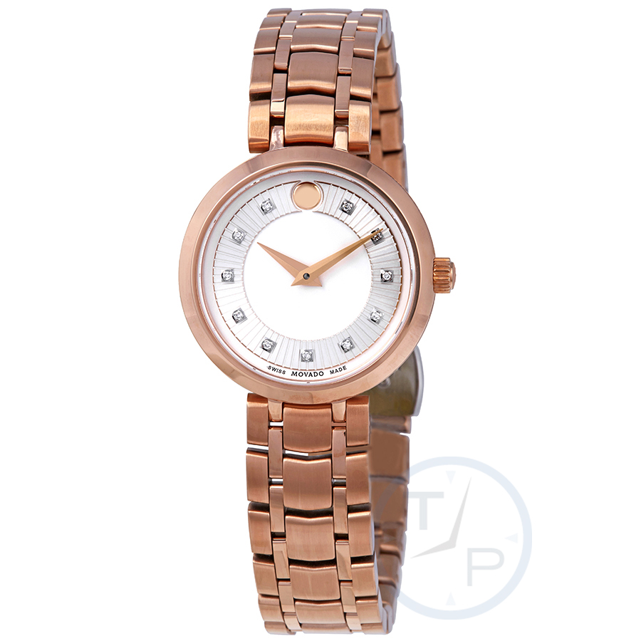 Rose gold PVD stainless steel case and bracelet. Fixed rose gold PVD bezel. Silver dial with rose gold-tone hands and diamond hour markers. The Movado dot appears at the 12 o'clock position. Dial Type: Analog. Quartz movement. Scratch resistant sapphire crystal. Pull / push crown. Solid case back. Round case shape. Case size: 28 mm. Case thickness: 7 mm. Band width: 12 mm. Fold over clasp with a push button release. Water resistant at 30 meters / 100 feet. Functions: hour, minute. Additional Info: dial set with 11 diamonds. Dress watch style. Watch label: Swiss Made. Movado 1881 Diamond Silver Dial Rose Gold PVD Ladies Watch 0607100.