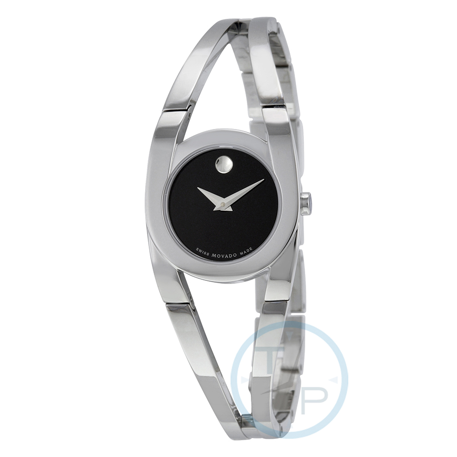 Stainless steel case with a stainless steel bangle bracelet. Fixed stainless steel bezel. Black dial with silver-tone hands. No markers. The signuture Movado dot appears at the 12 o'clock position. Dial Type: Analog. Quartz movement. Scratch resistant sapphire crystal. Push / pull crown. Solid case back. Case diameter: 24 mm. Case thickness: 6.5 inches. Round case shape. Band width: 19 mm. Band length: 6.5 mm. Fold over clasp. Water resistant at 30 meters / 100 feet. Functions: hours, minutes. Casual watch style. Watch label: Swiss Made. Movado Amorosa Black Dial Stainless Steel Ladies Watch 0606394.