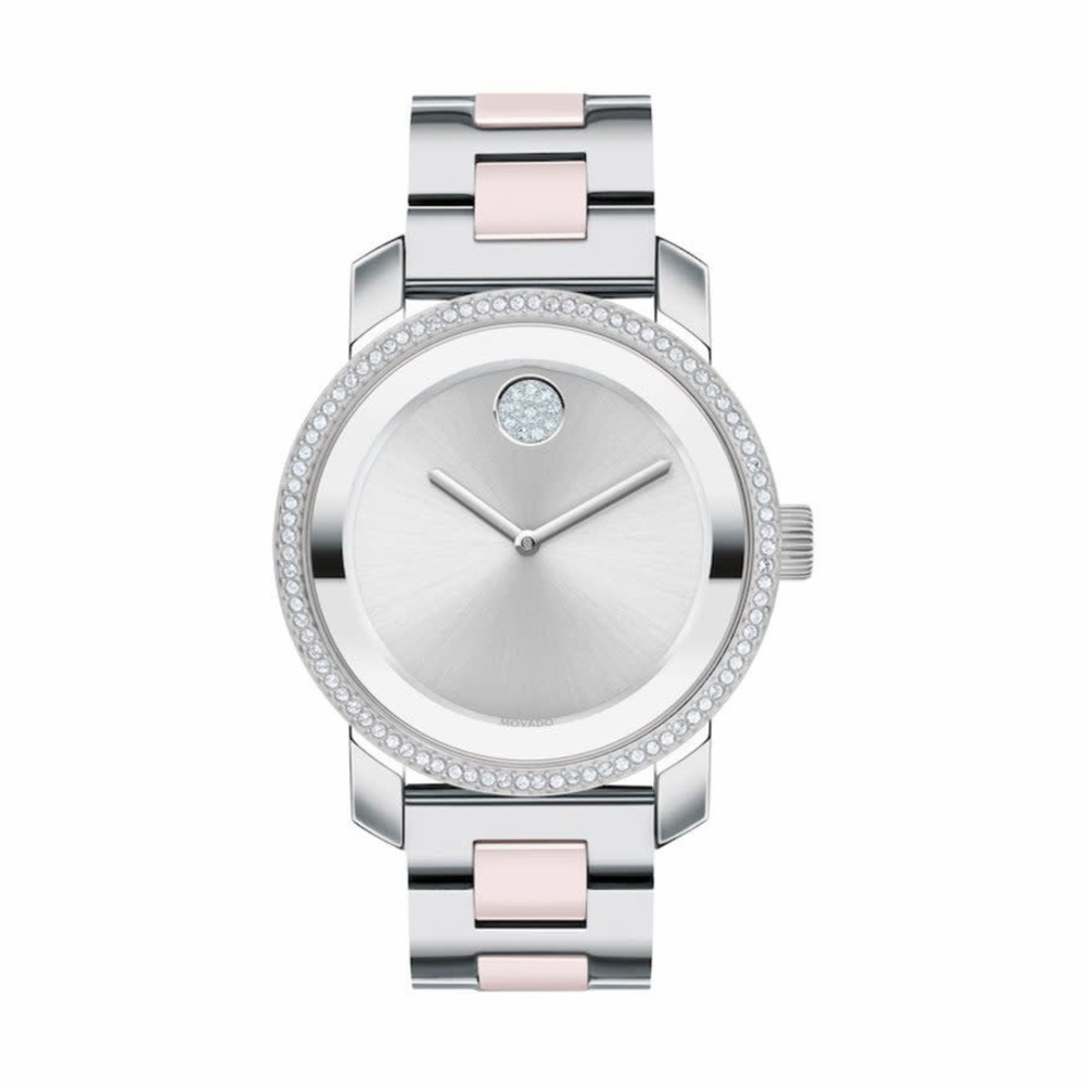 Silver-tone stainless steel case with a two-tone (silver-tone and pink) stainless steel & ceramic bracelet. Fixed silver-tone bezel with crystal set. Silver-tone dial with rose gold-tone hands. Dial Type: Analog. Quartz movement. Scratch resistant K1 crystal crystal. Solid case back. Round case shape, case size: 36 mm. Deployment with push button release clasp. Water resistant at 30 meters / 100 feet. Functions: hour, minute. Bold Series. Dress watch style. Movado Bold Quartz Crystal Silver Dial Ladies Watch 3600784.