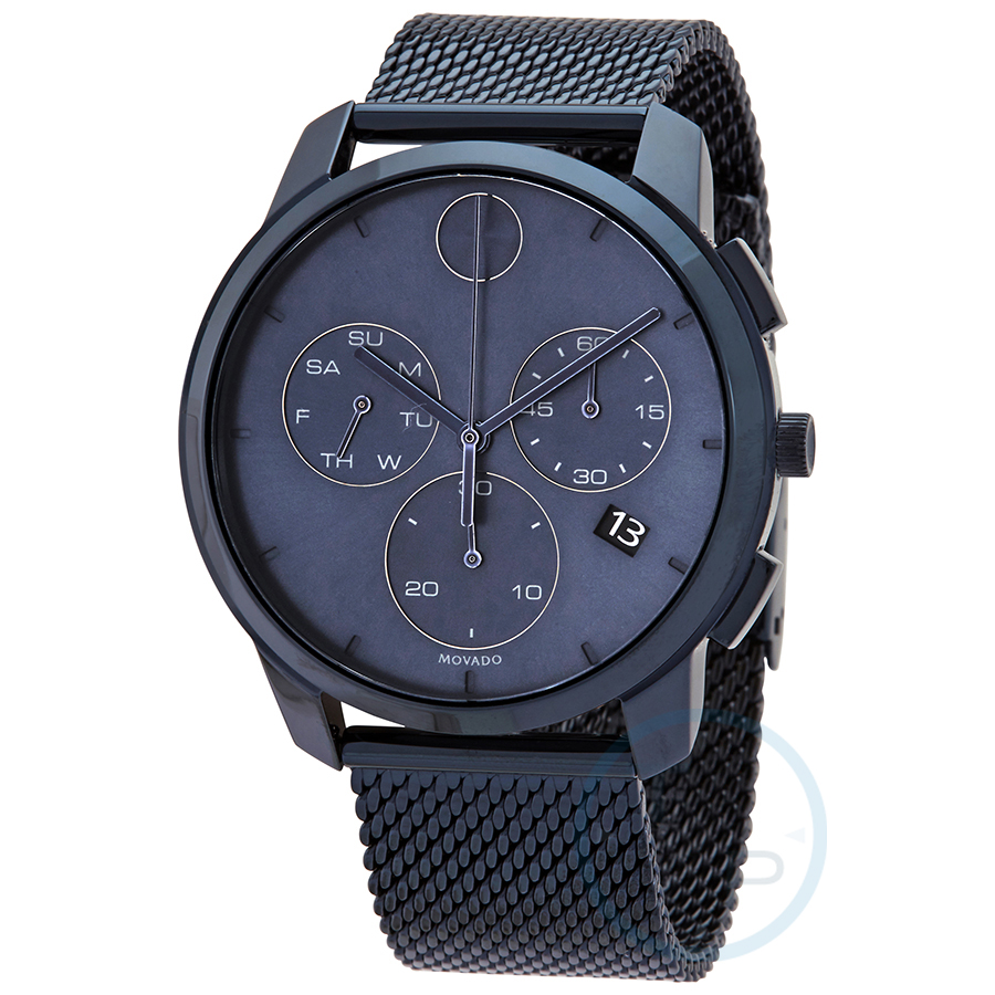 Blue ion-plated stainless steel case with a blue ion-plated stainless steel mesh bracelet. Fixed blue ion-plated bezel. Blue dial with luminous blue hands and index hour markers. The Movado dot appears at the 12 o'clock position. Dial Type: Analog. Luminescent hands. Date display at the 4 o'clock position. Chronograph - two sub-dials displaying: 60 second and 30 minute. Day of the week sub-dial. Quartz movement. Scratch resistant K1 mineral crystal. Pull / push crown. Solid case back. Round case shape. Case size: 40 mm. Case thickness: 10 mm. Band width: 20 mm. Fold over slip through clasp. Water resistant at 30 meters / 100 feet. Functions: chronograph, date, day of the week, hour, minute, second. Casual watch style. Watch label: Swiss Movt. Movado Bold Thin Chronograph Quartz Blue Dial Mens Watch 3600633.