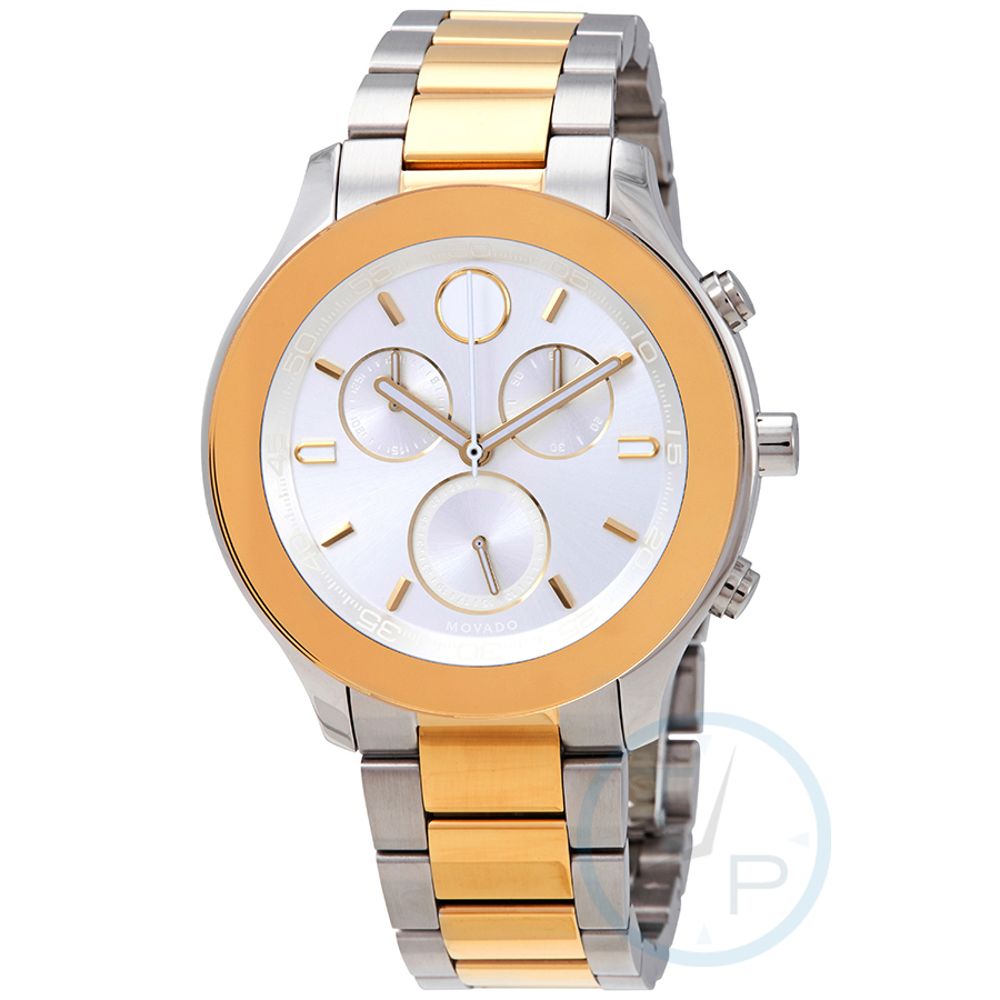 Stainless steel case with a two-tone (silver-tone and gold-tone) stainless steel bracelet. Fixed gold-tone bezel. Silver dial with luminous gold-tone hands and index hour markers. The Movado dot appears at the 12 o'clock position. Dial Type: Analog. Luminescent hands. Date display at the 6 o'clock position. Quartz movement. Scratch resistant sapphire crystal. Pull / push crown. Solid case back. Round case shape. Case size: 39 mm. Band width: 17 mm. Hidden fold over clasp. Water resistant at 30 meters / 100 feet. Functions: chronograph, date, hour, minute, second. Sport watch style. Watch label: Swiss Movt. Movado Bold Chronograph Quartz Silver Dial Ladies Watch 3600546.