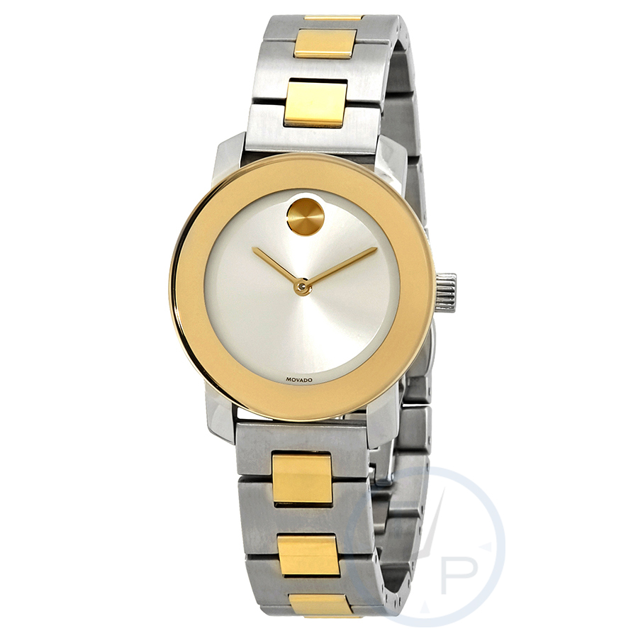 Silver-tone stainless steel case with a silver-tone/yellow gold-tone stainless steel two-tone bracelet. Fixed yellow gold-tone stainless steel bezel. Silver-toned sunray dial with yellow gold-tone hands and dot at 12 o'clock hour markers. Dial Type: Analog. Quartz movement. Scratch resistant k1 crystal. Solid case back. Round case shape. Case size: 30 mm. Deployment clasp. Water resistant at 30 meters / 100 feet. Functions: hour, minute. Casual watch style. Movado Bold Silver-Tone Sunray Dial Ladies Two-Tone Watch 3600551.