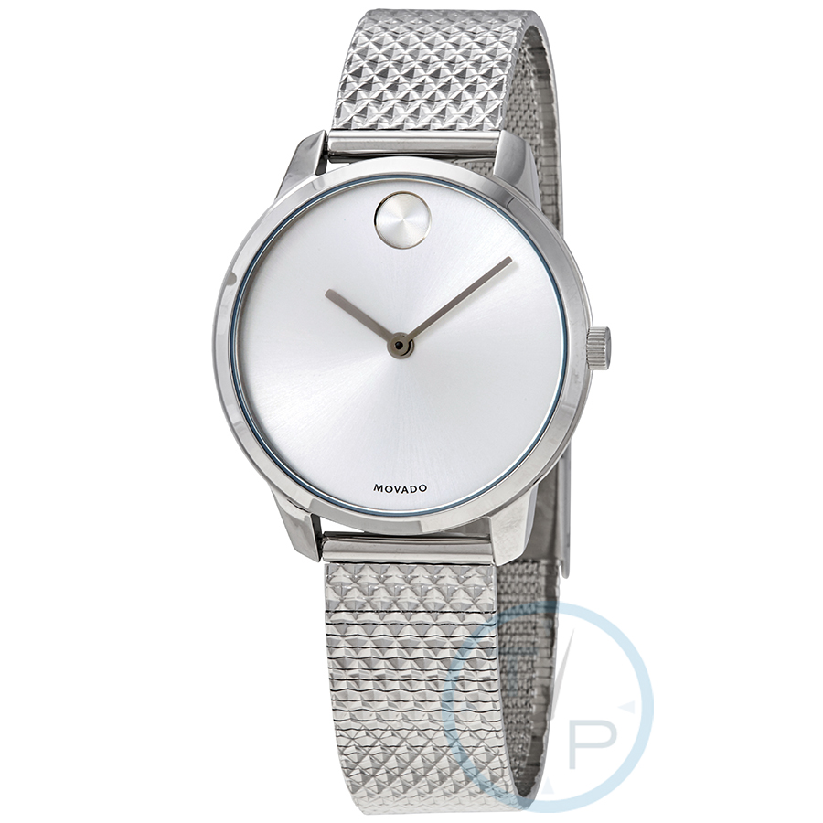 Stainless steel case with a stainless steel bracelet. Fixed stainless steel bezel. Silver dial with silver-tone hands. No markers. Movado dot appears at the 12 o'clock position. Dial Type: Analog. Quartz movement. Scratch resistant K1 mineral crystal. Pull / push crown. Solid case back. Round case shape. Case size: 35 mm. Case thickness: 6.55 mm. Band width: 16 mm. Slide through clasp. Water resistant at 30 meters / 100 feet. Functions: hour, minute. Casual watch style. Watch label: Swiss Made. Movado Bold Quartz Silver Dial Ladies Watch 3600595.