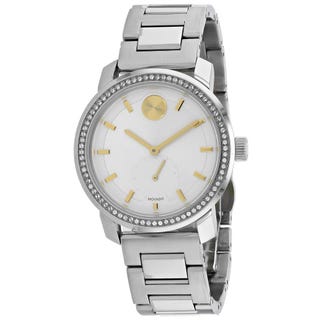 Stainless steel case with a stainless steel bracelet. Fixed stainless steel bezel set with crystals. Silver dial with gold-tone hands and index hour markers. The Movado dot appears at the 12 o'clock position. Dial Type: Analog. Small seconds sub-dial. Quartz movement. Scratch resistant mineral crystal. Pull / push crown. Solid case back. Round case shape. Case size: 36 mm. Case thickness: 10 mm. Band width: 18 mm. Deployment clasp. Water resistant at 30 meters / 100 feet. Functions: hour, minute, second. Dress watch style. Watch label: Swiss Movt. Movado Bold Quartz Silver Dial Ladies Watch 3600617.