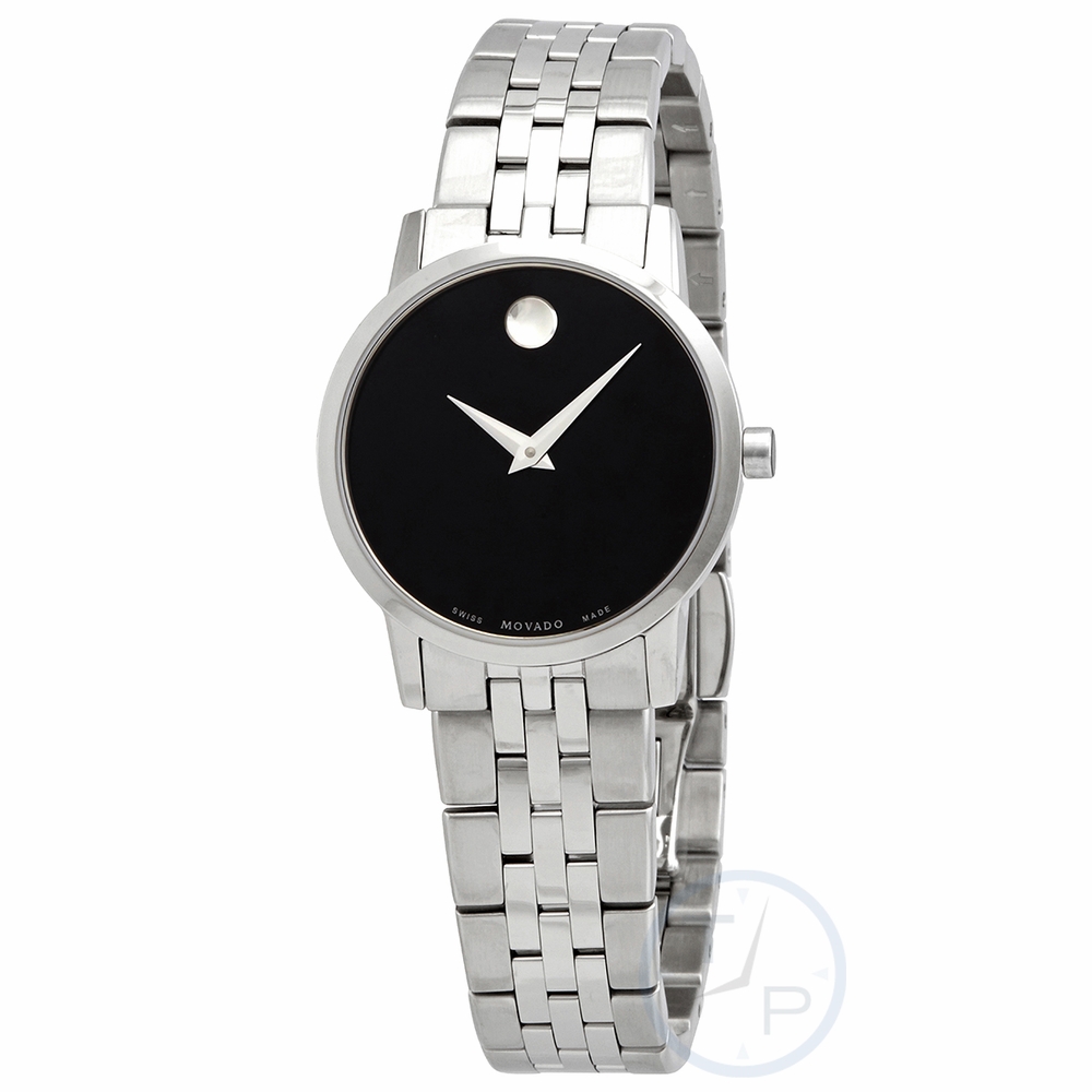 Silver-tone stainless steel case with a silver-tone stainless steel bracelet. Fixed silver-tone stainless steel bezel. Black dial with silver-tone hands. No markers. Movado dot appears at the 12 o'clock position. Dial Type: Analog. Quartz movement. Scratch resistant sapphire crystal. Pull / push crown. Solid case back. Round case shape, case size: 28 mm, case thickness: 10 mm. Band width: 14 mm. Fold over with push button release clasp. Water resistant at 30 meters / 100 feet. Functions: hour, minute. Casual watch style. Movado Museum Classic Quartz Black Dial Stainless Steel Mens Watch 0607397.