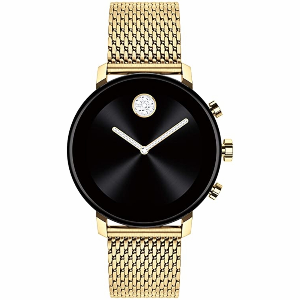 Yellow gold ion-plated stainless steel case with a yellow gold ion-plated stainless steel mesh bracelet. Fixed black ceramic bezel. Black dial with crystal-set gold-tone hands. No markers. Diamond-set Movado dot appears at the 12 o'clock position. Dial Type: digital. Scratch resistant gorilla glass crystal. Pull / push crown. Ceramic case back. Round case shape. Case size: 40 mm. Case thickness: 12 mm. Band width: 20 mm. Fold over slip through clasp. Water resistant at 1 atm / 34 feet. Functions: hour, minute, displays phone calls, texts, appointments, music, email and notifications. Additional Info: sensors: accelerometer, altimeter, ambient light, gyroscope, heart rate, microphone, nfc, untethered gps. Connect 2.0 Series. Sport watch style. Movado Connect 2.0 Digital Black Dial Unisex Smart Watch 3660026.