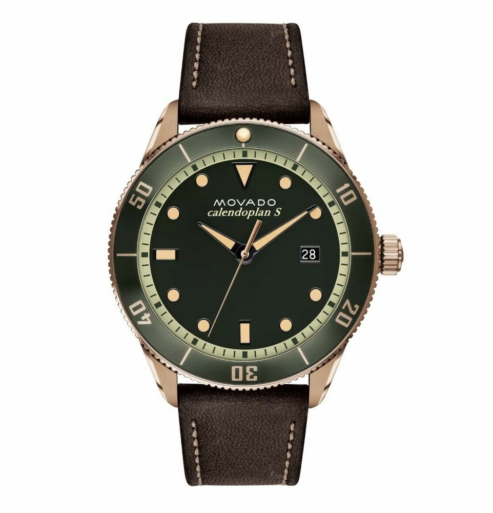 Bronze ion-plated stainless steel case with a brown leather strap. Uni-directional rotating bronze ion-plated bezel with an inlaid green ring. Green dial with rose gold-tone hands and dot hour markers. Minute markers around the outer rim. Dial Type: Analog. Luminescent hands and markers. Date display at the 3 o'clock position. Quartz movement. Scratch resistant sapphire crystal. Pull / push crown. Solid case back. Round case shape. Case size: 43 mm. Band width: 20 mm. Tang clasp. Water resistant at 50 meters / 165 feet. Functions: date, hour, minute, second. Heritage Series. Dress watch style. Watch label: Swiss Made. Movado Heritage Quartz Green Dial Mens Watch 3650092.