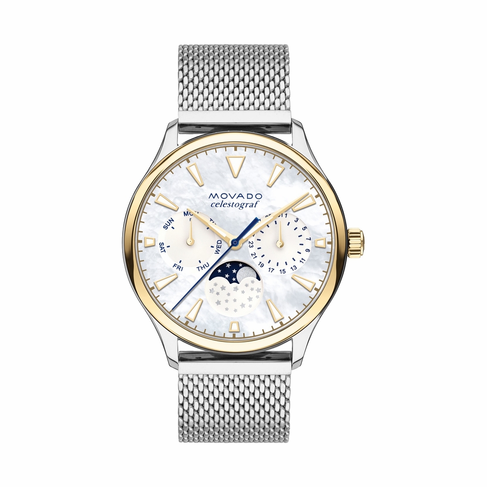 Silver-tone stainless steel case with a silver-tone stainless steel mesh bracelet. Fixed yellow gold ion-plated bezel. White mother of pearl dial with gold-tone/blue seconds hand hands and index hour markers. Dial Type: Analog. Date display at the 3 o'clock position. Three sub-dials displaying: date, day of the week, and moonphase. Quartz movement. Scratch resistant sapphire crystal. Pull / push crown. Solid case back. Round case shape, case size: 36 mm. Water resistant at 30 meters / 100 feet. Functions: date, day, hour, minute, second, moonphase. Heritage Series. Dress watch style. Movado Heritage Quartz White Mother of Pearl Dial Ladies Watch 3650104.