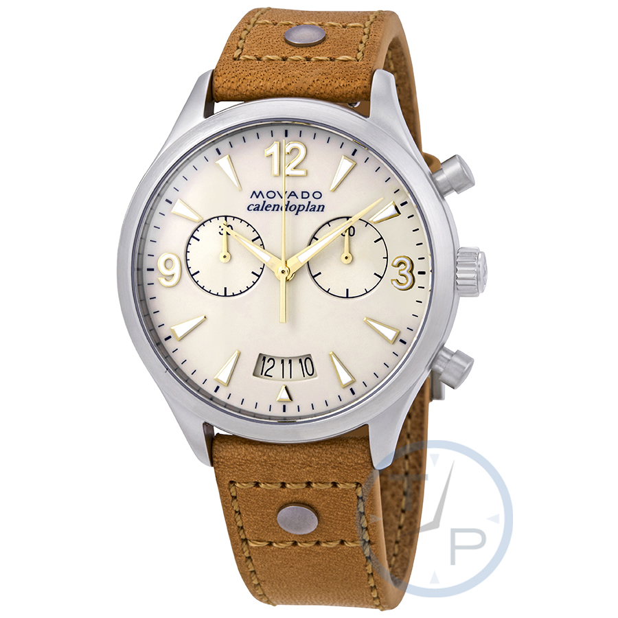 Stainless steel case with a brown (vachetta) leather strap. Fixed stainless steel bezel. Ivory dial with luminous gold-tone hands and index hour markers. Arabic numerals mark the 3, 9 and 12 o'clock positions. Minute markers around the outer rim. Dial Type: Analog. Luminescent hands and markers. Date display at the 6 o'clock position. Chronograph - two sub-dials displaying: 60 second and 30 minute. Quartz movement. Scratch resistant sapphire crystal. Pull / push crown. Solid case back. Round case shape. Case size: 38 mm. Band width: 18 mm. Tang clasp. Water resistant at 30 meters / 100 feet. Functions: chronograph, date, hour, minute, second. Sport watch style. Watch label: Swiss Made. Movado Heritage Chronograph Ladies Watch 3650027.