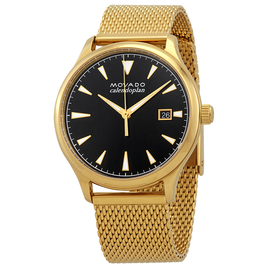 Gold-tone stainless steel case with a gold-tone stainless steel mesh bracelet. Fixed bezel. Black dial with gold-tone hands and index hour markers. Dial Type: Analog. Date display at the 3 o'clock position. Quartz movement. Scratch resistant sapphire crystal. Pull / push crown. Solid case back. Round case shape. Case size: 40 mm. Water resistant at 30 meters / 100 feet. Functions: date, hour, minute, second. Casual watch style. Movado Heritage Quartz Black Dial Mens Gold-tone Watch 3650088.