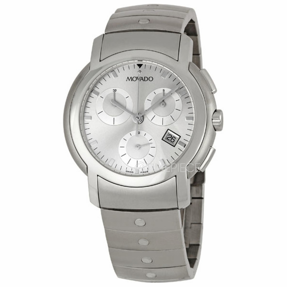 Stainless steel case with a stainless steel bracelet. Fixed stainless steel bezel. Silver dial with silver-tone hands and index hour markers. Minute markers around the outer rim. Dial Type: Analog. Date display at the 4 o'clock position. Chronograph - three sub-dials displaying: 60 second, 30 minute and 1/10th of a second. Quartz movement. Scratch resistant sapphire crystal. Pull / push crown. Solid case back. Round case shape. Case dimensions: 47 mm x 41 mm. Case thickness: 11 mm. Band length: 7.5 inches. Butterfly clasp. Water resistant at 30 meters / 100 feet. Functions: hours, minutes, seconds, date, chronograph. Sl Series. Sport watch style. Watch label: Swiss Made. Movado SL Chronograph Quartz Silver Dial Mens Watch 0605824.