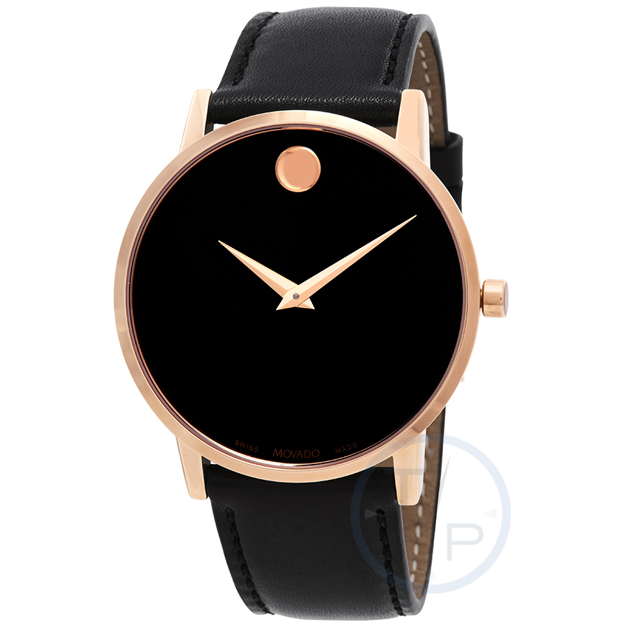 Rose gold PVD stainless steel case with a black (calfskin) leather strap. Fixed rose gold PVD bezel. Black dial with rose gold-tone hands. No markers. The Movado dot appears at the 12 o'clock position. Dial Type: Analog. Quartz movement. Scratch resistant sapphire crystal. Pull / push crown. Solid case back. Round case shape. Case size: 40 mm. Case thickness: 7 mm. Band width: 17 mm. Tang clasp. Water resistant at 30 meters / 100 feet. Functions: hour, minute. Dress watch style. Watch label: Swiss Made. Movado Museum Classic Black Dial Mens Watch 0607272.