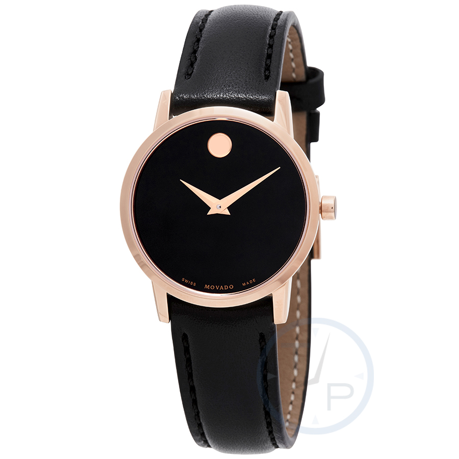 Rose gold PVD stainless steel case with a black (smooth calfskin) leather strap. Fixed rose gold PVD bezel. Black dial with rose gold-tone hands. No markers. The Movado dot appears at the 12 o'clock position. Dial Type: digital. Quartz movement. Scratch resistant sapphire crystal. Pull / push crown. Solid case back. Round case shape. Case size: 28 mm. Case thickness: 6.4 mm. Band width: 15 mm. Fold over clasp with a safety release. Water resistant at 30 meters / 100 feet. Functions: hour, minute. Dress watch style. Watch label: Swiss Made. Movado Museum Classic Black Dial Black Leather Ladies Watch 0607276.