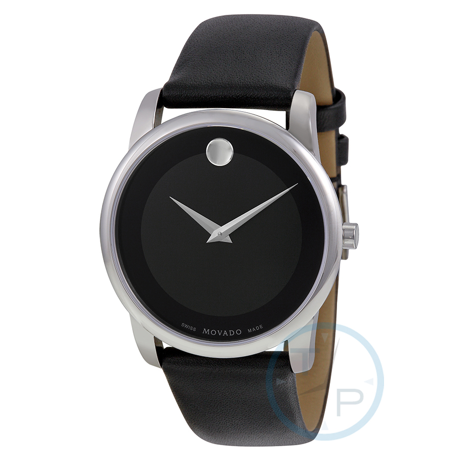 Stainless steel case with a black leather strap. Fixed stainless steel bezel. Black dial with silver-tone hands. No markers. The signature Movado Dot appears at the 12 o'clock position. Dial Type: analog. Quartz movement. Scratch resistant sapphire crystal. Solid case back. Case diameter: 40 mm. Case thickness: 7.8 mm. Tang clasp. Water resistant at 30 meters/ 100 feet. Functions: hours, minutes. Dress watch style. Movado Museum Black Dial Black Leather Men's Watch 0606502.