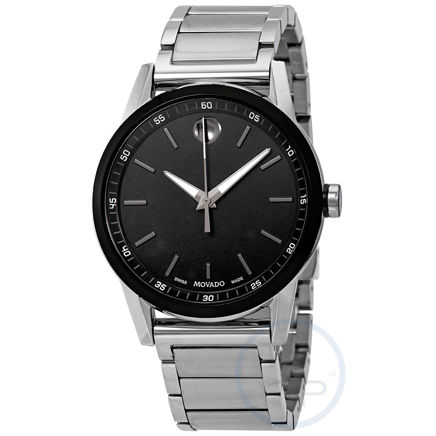Stainless steel case with a stainless steel bracelet. Fixed black PVD bezel. Black dial with luminous silver-tone hands and index hour markers. Minute markers around the outer rim. The Movado dot appears at the 12 o'clock position. Dial Type: Analog. Luminescent hands. Quartz movement. Scratch resistant sapphire crystal. Solid case back. Round case shape. Case size: 42 mm. Case thickness: 10 mm. Band width: 21 mm. Deployment clasp with a push button release. Water resistant at 30 meters / 100 feet. Functions: hour, minute, second. Casual watch style. Watch label: Swiss Made. Movado Museum Sport Black Dial Mens Watch 0607225.